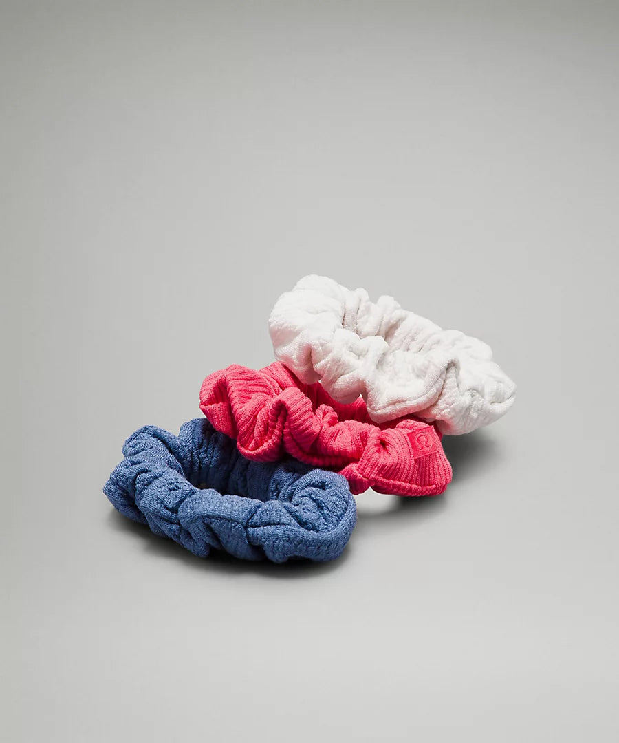 Lululemon Uplifting Scrunchies Textured 3 Pack in Nimbus/Glaze Pink/Oasis Blue