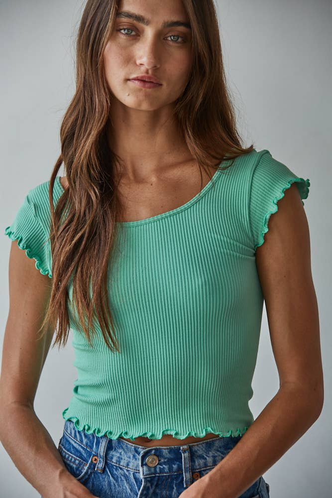 Say hello to the Betty Knit Seamless Ribbed Top—your new go-to for effortless cool. This short-sleeve crop features a stretchy nylon and spandex blend that moves with you, while the seamless construction keeps things smooth and comfortable. The ribbed texture adds visual interest, and those signature merrow details give it an elevated finish that feels anything but basic. With a scooped neckline and fresh light green hue, it's the perfect piece to show off your style. Dress it up or keep it casual—either way, you'll look amazing.
