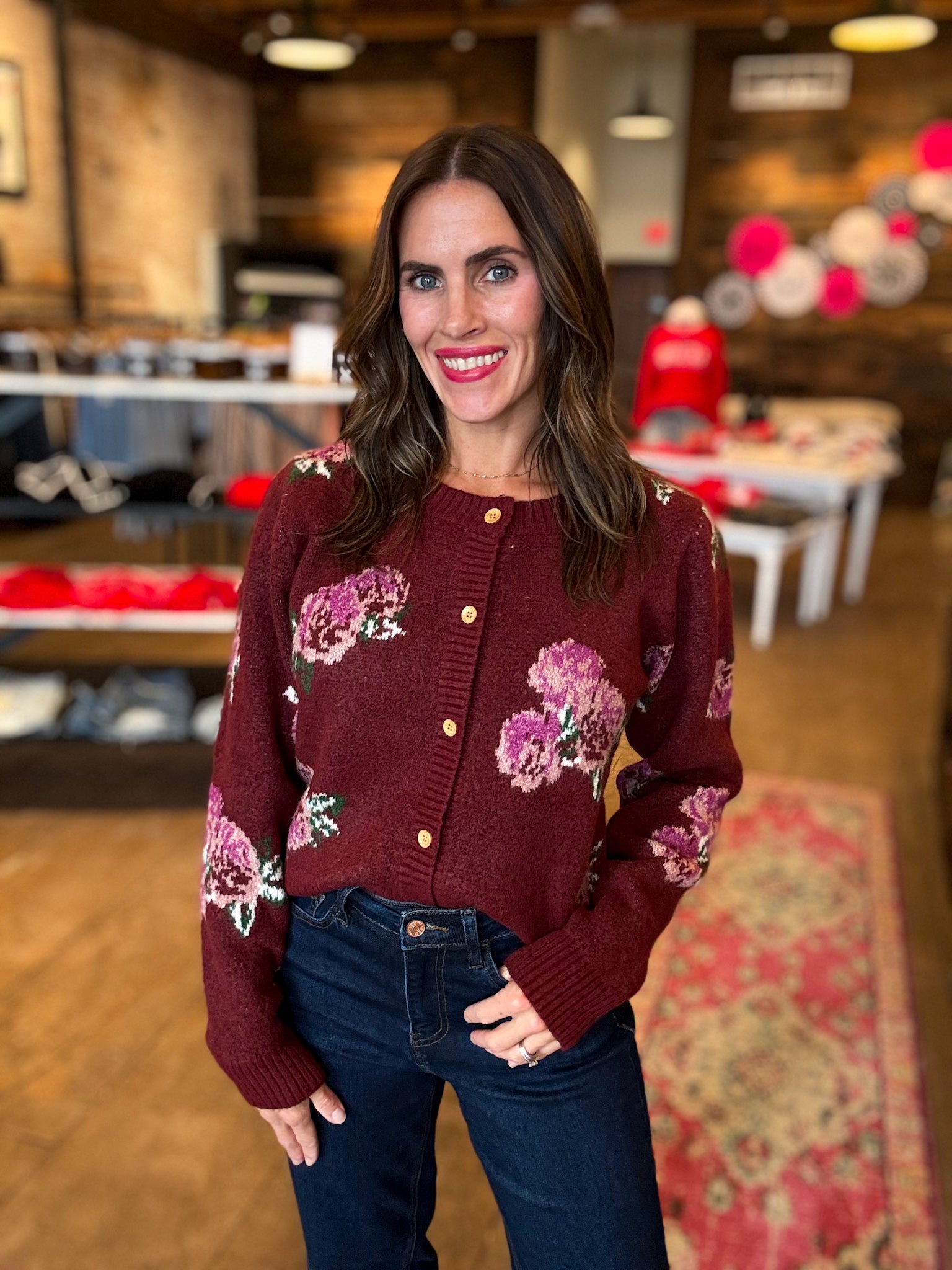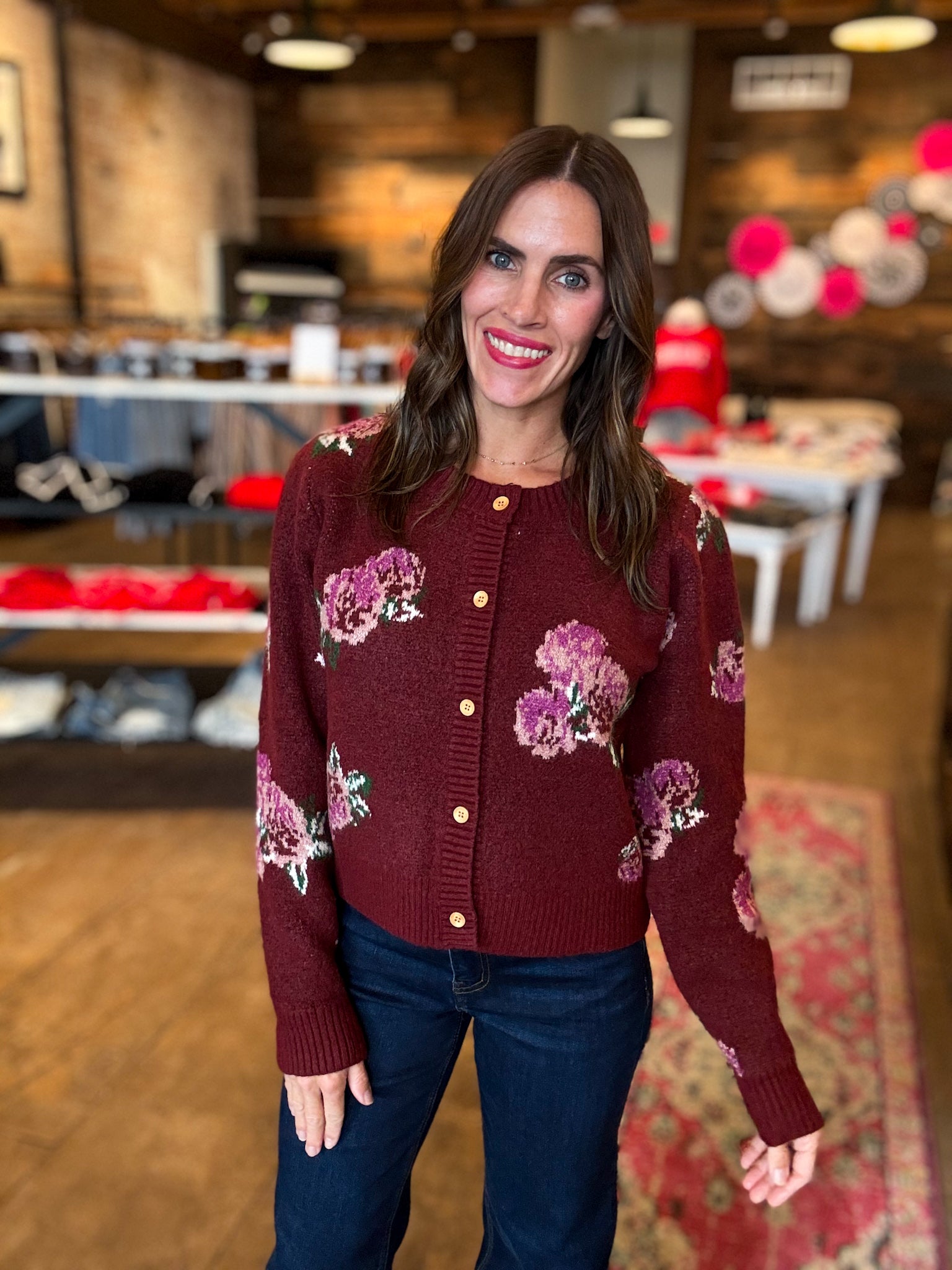 Elevate your wardrobe with this stunning wine-colored cardigan, where rich jewel tones meet delicate floral artistry. The sophisticated color palette creates a versatile piece that transitions seamlessly from casual gatherings to refined occasions. Crafted from soft sweater fabric, this cardigan drapes beautifully while the intricate floral print adds visual interest and timeless elegance. Layer it over your favorite pieces for warmth and style, or wear it open as a statement layer. Perfect for those who appreciate understated luxury and thoughtful design details.